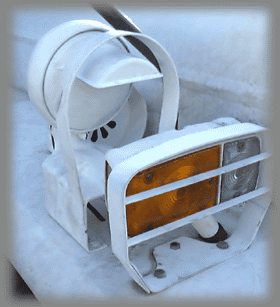 BOライトの光線は、運転席側から見て、幾分左側に流れるように放射されるので、このように右フェンダ上に設置してやれば、運転者の丁度正面あたりを照らしてくれるようになる。 防衛仕様のジープ(73式)のミラーが、ウインカより30センチほど後方にオフセットされているのに対し、民生用のジープはウインカのすぐ後方に位置する。 その為、ミラーとBOが隣り合わせになってしまい、少々窮屈そうであるが、捉えようによっては機能が凝縮されている感じが出ていて美しい。かもしれない。