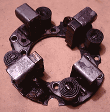 コミンテータを四方から挟み込み、バッテリーからの電流をアーマチュアに伝えるのが、このブラシ・ユニットである。モーターの最後部に位置し、後ろ蓋に2本のネジで固定される。